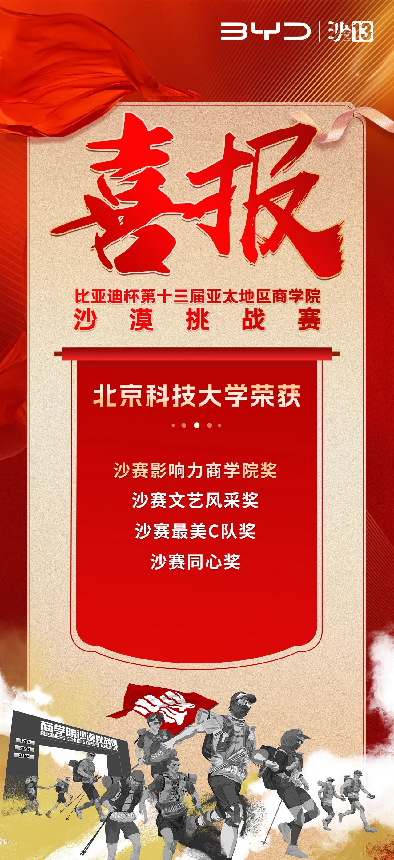 12月14日,比亚迪杯第十三届亚太地区商学院沙漠挑战赛颁奖盛典暨沙14启动仪式在南京圆满落幕。我院沙十三战队,凭借全体队员在沙十三赛事中奋勇拼搏的卓越表现和团结共进的精神风貌,斩获团体及个人荣誉奖项,载誉而归!