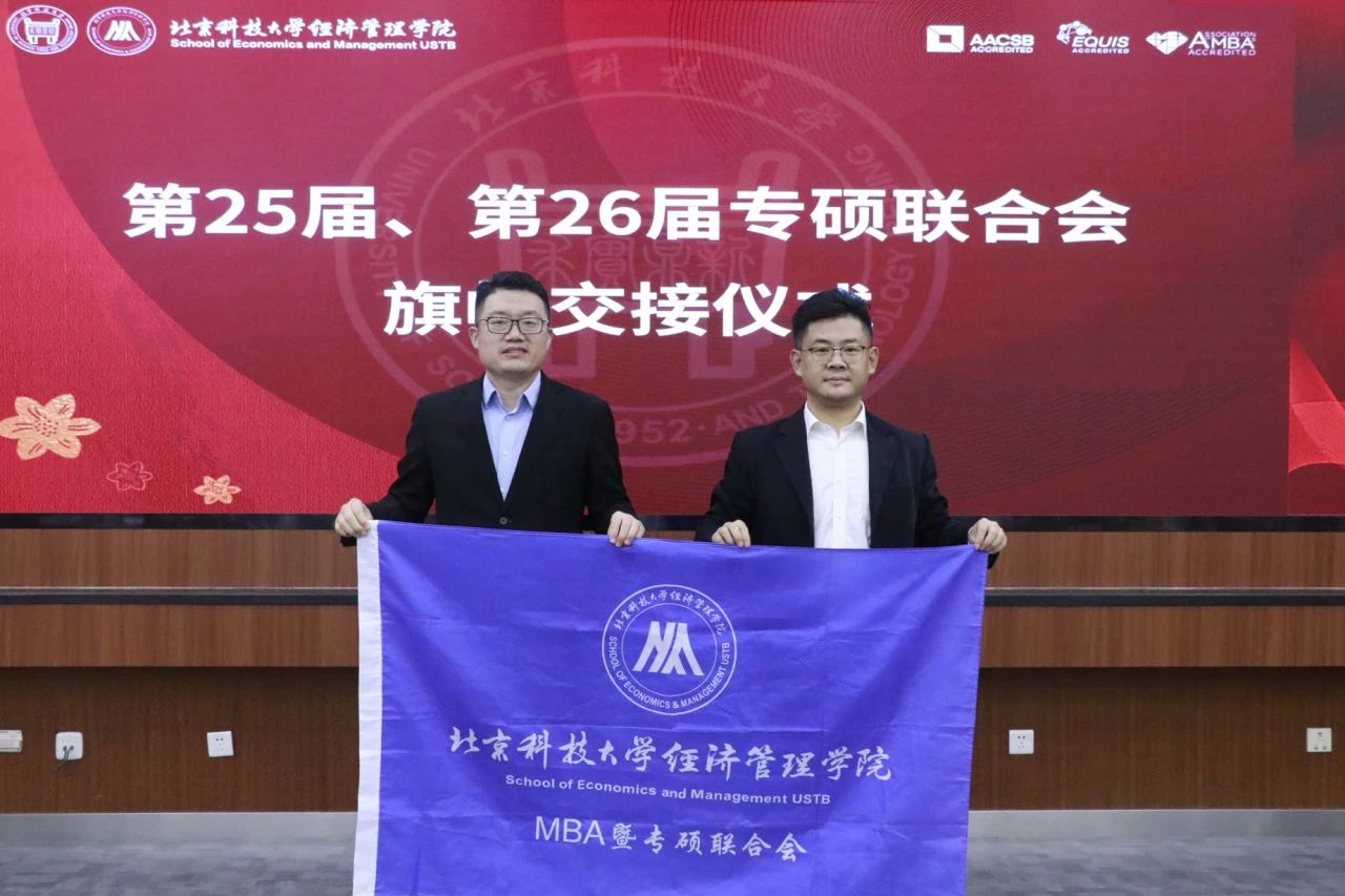第25届联合会主席徐磊与第26届联合会主席张新明共同上台进行了联合会旗帜的交接仪式。这不仅是一个仪式的结束,更是新征程的开始。今晚,我们共同见证了责任与使命的传递,感受到了激情与梦想的接力。在热烈的掌声与欢呼声中,我院第26届MBA暨专硕联合会竞选换届大会圆满落下帷幕。