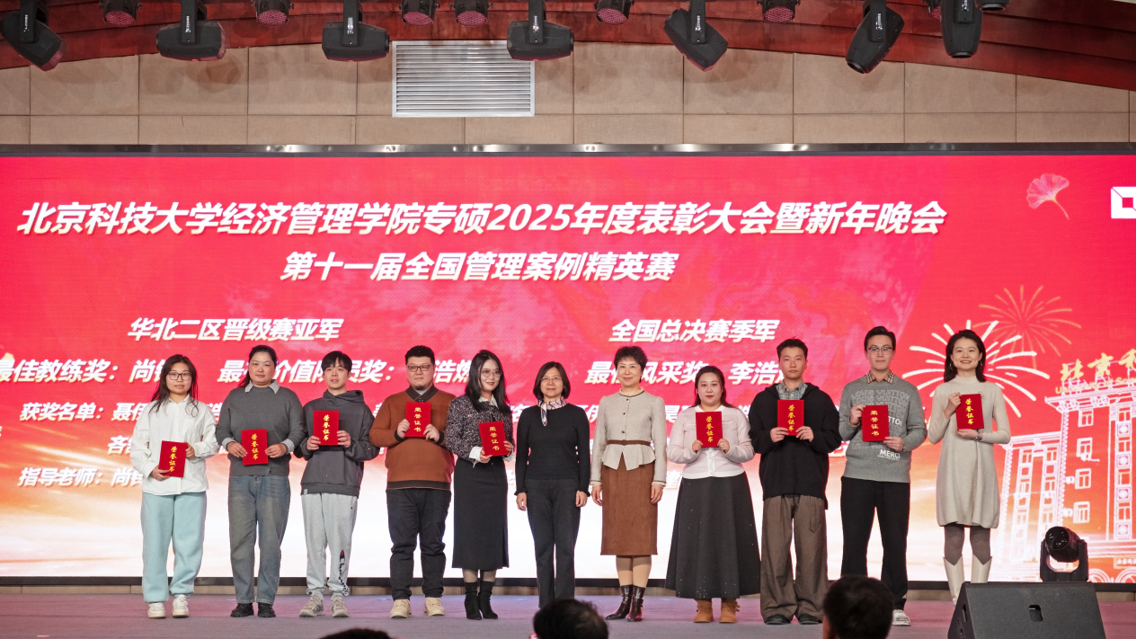 辞旧岁豪情满怀,迎新年信心百倍。2025年12月27日,以“经心筑梦 管创启航” 为主题的北京科技大学经济管理学院专硕2025年度表彰大会暨新年晚会隆重举行。学院党委书记武森教授、副院长黄晓霞教授以及学院教师代表、2024级和2025级专硕学生、校友代表、兄弟院校联合会成员欢聚一堂,共襄盛举,一同在欢声笑语中回首过去,展望未来。