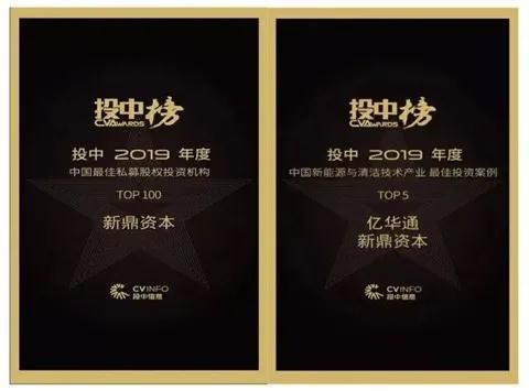 2019年新鼎资本斩获两项大奖:新鼎资本荣获投中2019年度“中国最佳私募股权投资机构TOP100”;被投企业——亿华通荣获投中2019年度“中国新能源与清洁技术产业最佳投资案例TOP5”。获得两项荣誉,是业界和社会对新鼎资本已实现投资成绩的肯定,更是一种支持和鼓励。未来,新鼎资本将继续坚持价值投资,挖掘优质企业,布局生态圈,推动企业发展壮大。